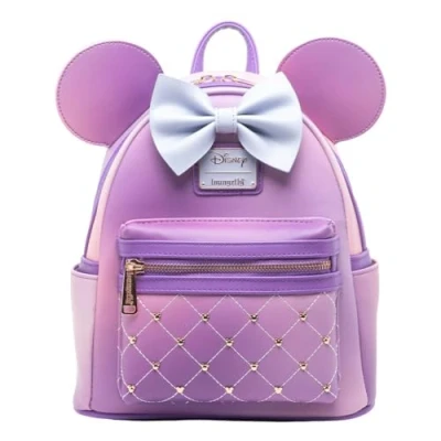 Material: Faux Leather Measurements: W 9" x H 10.5" x D 4.5" Wipe clean Get whisked away in the exquisite colors of the 7th release from our Classic Series! Introducing the 707 Street Exclusive - Loungefly Disney The Minnie Mouse Classic Series Mini Backpack - Lavender Haze. This faux leather Loungefly mini backpack features a gorgeous Purple and Pink gradient throughout the bag to create a dreamy exterior. On the top, you'll find a stunning Periwinkle bow and large mouse ears. Lovely, quilted stitching adorns the front pocket with rose-gold Mickey studs at each cross-section. Wherever you go, this bag is sure to add of touch of luxurious style to any outfit.