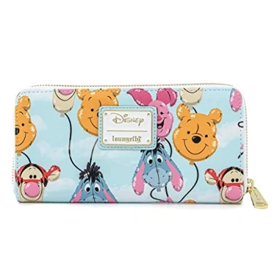 This wallet is an officially licensed Disney product. The Winnie the Pooh Balloon Friends Zip Around Wallet is made of vegan leather (polyurethane). Wallet zips closed, has sturdy metal hardware, and features printed details. Take note of the coordinating design of the inside lining fabric. Wallet Dimensions: 4" W x 8" H (Please note: width is measured across the bottom of the wallet.)