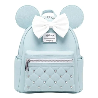 Material: Faux Leather Measurements: W 9" x H 10.5" x D 4.5" Wipe clean Find the beauty in simplicity with the 707 Street Exclusive - Loungefly Disney The Minnie Mouse Classic Series Mini Backpack - Elegance! This gorgeous faux leather Loungefly mini backpack is the second release in the Classic Series. It features the iconic Minnie Mouse details with a matte white bow and a dreamy mint color from head to toe - or ears to toe! Over the front pocket, you'll find intricate, quilted stitching with shiny silver studs shaped like a familiar friend! This bag will add a little sprinkle of elegance to any outfit!