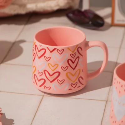 Celebrate love with this 540ml pink ceramic mug featuring heart-themed prints and “Love” lettering. Available in 4 adorable designs perfect for gifting or cosy sipping.. 540ml ceramic mug ideal for tea, coffee, or cocoa. Soft matte pink finish with heart and “Love” patterns. Comfortable rounded handle for daily use. Material- Ceramic. Finish- Matte glaze. Dimensions: Approx. 9 cm (H) x 9 cm (D). Care Instructions: Hand wash recommended. Not microwave safe.. Great for Valentine’s, anniversaries, or self-care moments. Choose from 4 cute assorted designs