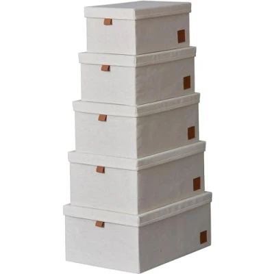 More order: this practical set of storage boxes with lids quickly keeps things organized; the 5 boxes of different sizes come packed together and are already assembled TIMELESS DESIGN Each box with lid is covered with cotton linen blend fabric and convince with simple design and nice touch; Handles and logo are crafted from fine textile leather Quality and stability: the organiser box is particularly stable, because walls and lids are reinforced with wooden panels (MDF); the stacking boxes are foldable and space-saving when not in use Versatile: the fabric boxes keep closets and shelves tidy and fit in the living area, ideal for storing clothes in the bedroom, decorating the living room, office, etc. Box contents: 5 x storage baskets with fabric lid, beige, dimensions: set of 5 in sizes 40 x 27.5 x 17.5 cm, 37.5 x 25 x 16.5 cm, 34.5 x 23 x 15.5 cm, 32 x 20 x 14.5 cm, 30 x 18 x 13.5 cm (L x W x H)