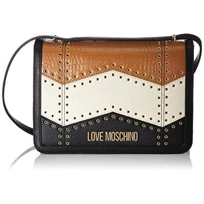MATERIAL: This bag has been made from a mix of materials: calf, synthetic PU with crocodile print and synthetic PU with lizard print. BAG TYPE & DESIGN: Shoulder bag equipped with adjustable shoulder strap. The combination of bands with different texture and color gives character to the bag, making it unique and original. DECORATIONS: The geometric cuts of the contrasting bands are emphasized by small metal studs. The Lettering logo in gold electroplating adds a precious and iconic touch. CLOSURE & INSIDE: Front flap with magnetic closure. Lined interior with zip pocket. Let yourself be captivated by the new Fall Winter 2021 pre-collection of Love Moschino women's accessories and bags. Addictive, feminine and authentic: find the bag that reflects your uniqueness and you won't be able to go out without it.
