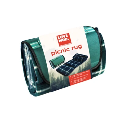 Waterproof backed picnic rug.Waterproof backed picnic camping beach rug. Soft touch polyester tartan design upper material. L136cm x W107cm (size approx). Folds ups and secures with velcro strap with integral carry handle.