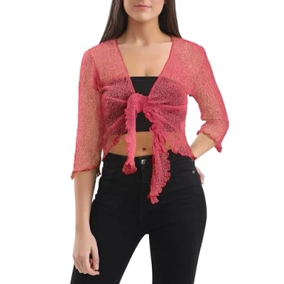 Love My Fashions® Women’s Fish Net Knitted Tie Up Bolero Shrug Top Ladies 3/4 Sleeve One Size Fits All Coral