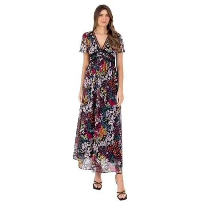 MAXI DRESSES FOR WOMEN: Lovedrobe presents V-neck short sleeve evening dresses. Available in a multicoloured Floral Print on a black base colour, and in 10 UK/EU sizes: 8 UK (36 EU), 10 UK (38 EU), 12 UK (40 EU), 14 UK (42 EU), 16 UK (44 EU), 18 UK (46 EU), 20 UK (48 EU), 22 UK (50 EU), 24 UK (52 EU), 26 UK (54 EU). FLORAL PRINT DRESSES: The women's maxi dress features a floral print, crochet trim, a V-neckline and short angel sleeves. Crafted from a high quality Chiffon fabric with shimmering thread detail, the A-line dress has a stunning floor-length skirt, while a concealed zip at the back provides easy wear. A-LINE DRESS FOR LADIES: Feel comfortable in any situation in the A-line cut of this elegant dress. The flowy skirt of the A-shape dress allows for free and easy movement. Whether sitting down or having a dance, you will always feel cosy and relaxed. A-line dresses suit all body types - regular or plus size - highlighting curves and ensuring a cosy and relaxed feel. FABRIC COMPOSITION: Crafted from 100% polyester chiffon, the floral print dress combines style with comfort. Crochet trims and shimmering thread details elevate the versatile dress, ensuring timeless elegance. ONE DRESS, DIFFERENT OCCASIONS: From wedding guest to bridesmaid, graduation to formal evenings, this versatile midi dress is a standout choice for various occasions. Versatility makes it perfect for maternity photoshoots, ensuring elegance in every moment with this exquisite occasion dress.