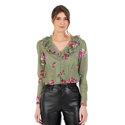 RUFFLE BLOUSES FOR WOMEN: Lovedrobe presents V-neckline ruffle tops for women. Available in three different colour options: Green Floral Print, Pink with Metallic Thread and Watercolour Print and 10 UK/EU sizes: 8 UK (36 EU), 10 UK (38 EU), 12 UK (40 EU), 14 UK (42 EU), 16 UK (44 EU), 18 UK (46 EU), 20 UK (48 EU), 20 UK (48 EU), 20 UK (48 EU), 20 UK (48 EU), 20 UK 2 uk (5) 0 EU), 24 UK (52 EU), 26 UK (54 EU). LONG SLEEVE WOMEN'S TOPS: This women's long sleeve blouse from the Lovedrobe collection showcases a layered ruffle trim on a V-neckline, adding a romantic touch. A full button-up front and long sleeves with a three-button fastening allow easy wearability for this versatile women's blouse. V-NECK BLOUSES FOR LADIES: Feel comfortable in any situation with the light chiffon material and the regular fit of this elegant V-neck blouse, suitable for varying body types, regular and plus size, highlighting curves and ensuring a cosy and relaxed feel. ONE BLOUSE, DIFFERENT OCCASIONS: From office wear to going out, graduation to formal evenings, this versatile V-neck top is a standout choice for various occasions. Versatility makes it perfect for maternity photoshoots, ensuring elegance in every moment with this exquisite long sleeve women's top. FABRIC COMPOSITION: Crafted from 100% polyester chiffon, the light and airy women's ruffle top perfectly combines style with comfort. The differing colour options feature varying style notes, such as floral prints and shimmering metallic thread detail, ensuring timeless elegance on this versatile women's smart casual blouse.