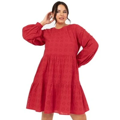 Lovedrobe Women's Ladies Smock Dress Knee Length Round Neck Long Puff Sleeve Broderie Anglaise Shift Cotton Casual Red 16