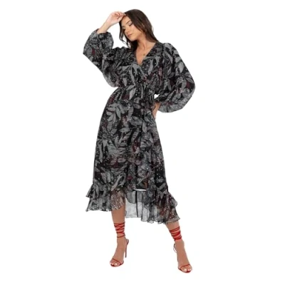 Lovedrobe Women's Midaxi Dress Ladies Long Balloon Sleeve V Neck Faux Wrap Ruffle Frilly for Wedding Guest Party Occasion Casual, Black, 8