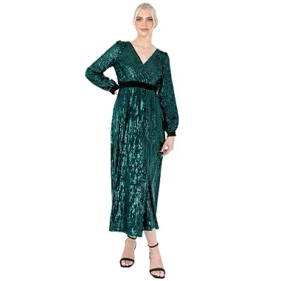 Lovedrobe Women's Midaxi Dress Ladies Sequin Embellished Long Sleeve V Neck Faux Wrap Velvet Bow Split for Party Evening Occasion, Green, 10