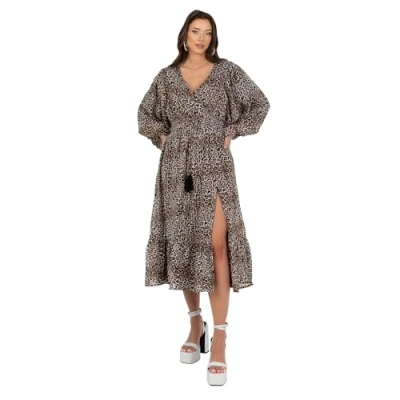 Lovedrobe Women's Midi Dress Ladies V Neck Long Balloon Sleeve Faux Wrap Thigh Split Shirred Waist Tassel Belt A line Smart Casual, Beige, 22