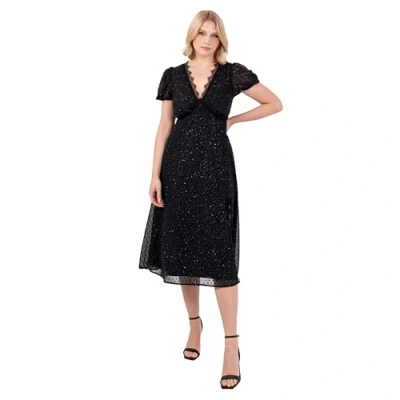 Lovedrobe Women's Midi Dress Ladies V Neck Short Puff Sleeve Glitter Chiffon Lace Trim Side Split Shirred Back Party Evening, Black 16