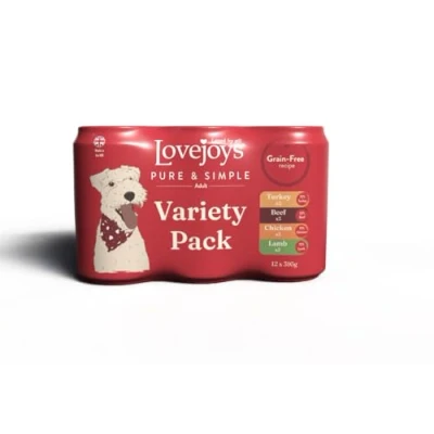Lovejoys Pure & Simple Grain Free Tinned Variety Pack Adult Dog Food 395g (Pack of 12) 72 Percent Meat Lamb Beef Chicken Turkey