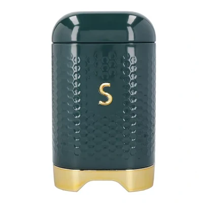 The Lovello Textured Sugar Canister in Hunter Green is a chic and elegant way to store sugar - whether that be granulated, sugar cubes or sweeteners. This stylish sugar canister with its tall sides and neat, square footprint combines contemporary geometric textures and retro curves and is finished in a rich dark green powder coating with contrasting brass coloured feet.Solidly built from carbon steel, this sugar canister is tough enough for the busiest of kitchens and can be easily wiped clean with a damp cloth. The contents of this canister are kept fresh thanks to the secure lid with its tight seal that easily pops off and on. For easy identification this sugar canister features a copper coloured 'S' on its side.This textured metal sugar canister is part of the Lovello collection, a range of matching items that include cake storage tins, beverage canisters and utensils holders that offer a stylish and coordinated look for the kitchen.Dimensions: 11.5cm x 11.5cm x 19.5cm.The Lovello Textured Sugar Canister in Hunter Green is supplied with a 1 year manufacturer's guarantee.