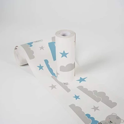 Ecological Wallpaper Border for kids, made from paper Product features: spongeable, good lightfastness, dry removeable, quick and easy to apply, suitable for lightly textured walls (woodchip) and smooth surfaces, Made in Germany Without PVC and plasticizer Self-adhesive, Manufacturer: A.S. Création