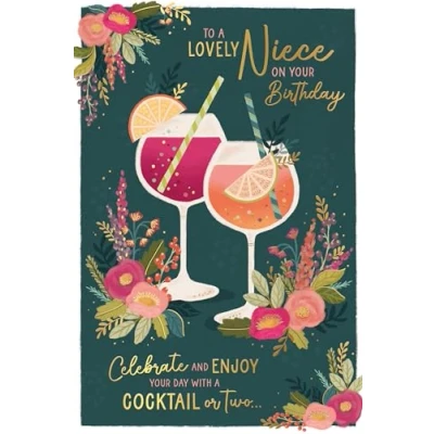 STYLISH BIRTHDAY CARD FOR A LOVELY NIECE - she'll be delighted to receive this gorgeous card featuring two glamorous cocktails UNIQUE ARTWORK - with further illustrations inside and with luxury gold foil lettering, this is the perfect card to send birthday wishes to a lovely niece WARM WORDS - The message on the front reads: 'To a lovely niece on your birthday. Celebrate and enjoy a cocktail or two'. The message inside reads: 'Because you are a lovely niece and your birthday should be too! With love'. PREMIUM QUALITY CARD MEASURES 6 X 9 INCHES (15 X 22 CMS) - made from the highest quality materials and with beautiful artwork designed to delight DESIGNED BY WISHING WELL STUDIOS - every Wishing Well card is designed to delight. Our unique, high-quality cards are created in the UK and are designed to mark every occasion