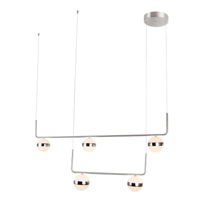 This stylish pendant lamp LOVEST made of nickel-matt impresses with its shape. The five rounded glasses, attached to ropes and rods at two different heights, bring light back into your living area. The opal glasses are wrapped in a narrow chrome ring. This interior light provides 3000 lumens of strong light. The included LED bulb (40W) promises a power saving for your wallet. This ceiling lamp brings cozy warm-white 3000K light into the room. With other models of this series, nothing stands in the way of your individual living room design. Product features: Pendant lamp metal nickel matt, acrylic opal, chrome ring, lxwxh: 1300x380x1500mm, incl. led 40w 230v, 4000lm source, 3000lm output, 3000k