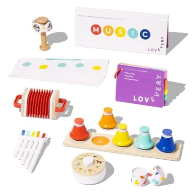 THE MOST COMPREHENSIVE MUSIC SET: An easy-to-follow learning system that teaches children to play real music by matching notes by color or letter. Inside the music box, you’ll find 5 instruments, a working metronome, and a Rhythm & Songs Book that teaches children how to create their own music. Plus, the stage-based Play Guide provides you with tips for engaging with your child as their skills advance. START LEARNING EARLY: Designed to grow with children from ages 18 to 48+ months. According to brain scientists, musical performance can be every bit as important educationally as reading or writing. From identifying patterns through color and sound, to decoding sounds that help process words, The Music Set by Lovevery not only grows your kids’ music skills, it unlocks other benefits like speech development, early math skills, and even impulse control. HOURS OF MUSICAL FUN: The Music Set is one of the most thoughtfully crafted toddler music toys. It includes: Pentatonic Pat Bells, Color Tab Pan Flute, Loud & Quiet Stackable Shakers, Jingle Bracelet with Wooden Handle, Animal Metronome, Simple Concertina, Rhythm & Songs Book, and a Lovevery Play Guide that includes engaging activity ideas and guidance on how to help your child learn. It provides hours and years of play within a single package. SUSTAINABLE: A sustainable and durable gift, designed for safety and longevity. The Music Set is skillfully crafted from organic materials: sustainably harvested wood certified by the FSC, soy-based ink, child-safe plastics, and stainless steel. MUSIC TO PARENTS’ EARS: The Music Set was developed with parents' ears in mind. The instruments all use the pentatonic scale: 5 notes that always sound harmonious when played together. Being easy on the ears also benefits children’s music learning journey. That’s because being able to play something that sounds good—no matter what—helps build excitement and confidence., Manufacturer: Lovevery