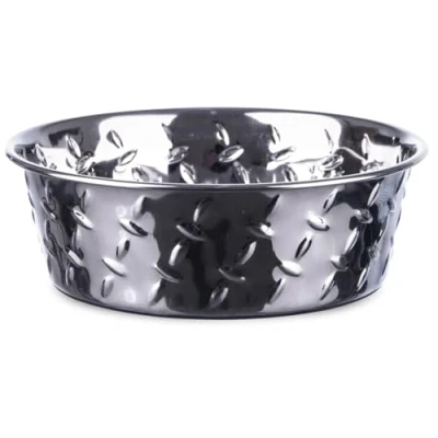 DIAMOND PLATE DESIGN: Side walls have a unique design giving the bowls a rugged look BACTERIA RESISTANT: Healthier for your pet and does not retain odours RUBBER BASE: Prevents slding and skidding resulting in reduced noise and spills Available in five sizes DURABLE: Rust proof stainless steel interior that is made to last