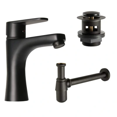 The Matt Black Low Mixer Basin Tap combines contemporary design with a stunning matt black finish, making it ideal for any bathroom or en-suite. This tap stands 170mm tall and features a single-lever design for easy temperature and flow control. The black finish brilliantly contrasts white basins, adding a sleek touch to your decor. An elegant waterfall flow enhances its modern style. Durable and dependable, the tap has an internal ceramic cartridge for smooth operation over time. It includes a black slotted waste and a black bottle trap, completing your bathroom kit. Installation is hassle-free with a fixing kit and two 50cm braided tap connectors. The tap is suitable for medium/high-pressure systems, requiring at least 0.5 bar pressure for consistent water flow. The spout measures 140mm from the back, and the complete kit offers high-quality performance for a modern bathroom upgrade.. Low Matt Black Basin Mixer Tap with Black Slotted Waste & Black Bottle Trap Clickbasin