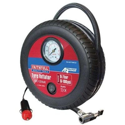 General description This compact and efficient 12-volt tyre inflator is designed for easy maintenance of tyre pressures. It is simple to operate and suitable for inflating or topping up tyres quickly and accurately. Technical specifications Maximum pressure: 100 psi / 7 bar Cable length: approximately 2.8 meters Hose length: 60 centimeters Compatibility and accessories Compatible with all car tyres using a Schrader valve Includes additional adaptors for inflating balls, toys, and other inflatable items Installation Simply plug into a 12-volt car power outlet (cigarette lighter socket) Usage Operate the device by switching it on to inflate or adjust tyre pressure Use the integrated analogue pressure gauge to monitor PSI and bar readings Connect the 60cm rubber hose with Schrader valve to the tyre valve for inflation