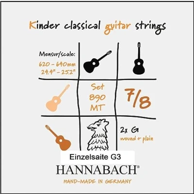 HIGH-QUALITY MATERIALS: The treble strings G3 of the 890 MT series for 7/8 children's guitar are made from Precision Round Nylon, ensuring excellent sound quality and durability. PERFECTLY TUNED FOR CHILDREN: The string tension of these guitar strings is specially tuned for children, making playing easy and pleasant, ideal for small hands and beginners. MADE IN GERMANY: The Hannabach classical guitar strings are manufactured in Germany and represent outstanding quality and precision, upon which one can rely. IDEAL FOR 7/8 CHILDREN'S CLASSICAL GUITAR: These strings are perfect for 7/8 children's classical guitars with a scale of 620-640 mm/24.4"-25.2". They are also ideal for stringing a Guitalele in guitar tuning. MEDIUM TENSION: The strings have a medium tension (MT), which provides a balanced playing feel and a warm, full sound. The G3 plain diameter and tensions are 1.03 mm/.040"; 6.4 kg/14.11 lbs.
