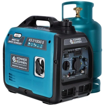 ManoManoGeneral description The KS 2100iG S LPG/petrol inverter generator by Könner & Söhnen is a compact, quiet, and reliable power source. It delivers pure sine wave output, making it suitable for sensitive electronics. This dual-fuel generator runs on both petrol and LPG (propane-butane) and includes all necessary accessories for LPG use. With its soundproof housing, it operates at a low noise level of 62 dB, making it ideal for home backup, camping, fishing, and other outdoor activities. Lightweight and portable, this generator is easy to move and store. Technical specifications Maximum power: 2000 W* Nominal power: 1800 W* Voltage: 230 V Frequency: 50 Hz Max current: 8.70 A Engine model: Könner & Söhnen KS 110i Engine type: Four-stroke, petrol-powered, air-cooled Engine volume: 79.7 cm³ Engine power: 3.3 hp Fuel tank volume: 4.0 L Crankcase volume: 0.35 L Noise level: 62 dB (Lpa at 7m), 87 dB (Lwa) Net dimensions (L×W×H): 480 × 290 × 430 mm Gross dimensions (L×W×H): 510 × 320 × 475 mm
