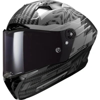 Safety: Emergency Release System, Double D Ring, Multi-Density EPS, Visor Button Lock, Reinforced Chin Strap, Reflective Safety Patch Ventilation: Chin, Front and Top Vent, Spoiler exhaust vent, Channelled EPS, Breath Deflector. Comfort: Removable and Washable, Breathable, Hypoallergenic, Laser-Cut Foam Visor: Pinlock MaxVision Included, Double Injection seal System, Quick Release System, Metallic Ratchet Mechanism, Scratch Resistant, UV Resistant, Ready for Tear OFF Enjoy riding with our top racing helmet developed from our knowledge acquired in motorsport racing. Racing spoiler for maximum aerodynamics. 100% carbon fiber shell. Excellent peripheral vision. Emergency release cheek pad system. Wide anti-scratch visor prepared for the anti-fog system, Pinlock Max Vision.