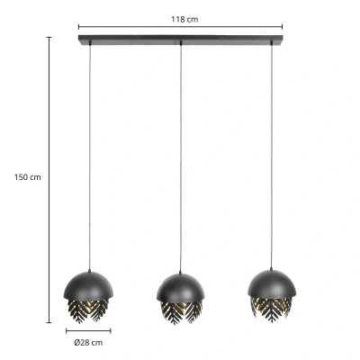 General description This stunning Aparas ceiling light features a modern industrial design with a unique fern-look leaf decoration. It includes three lampshades that hang in a row, resembling black hemispheres adorned with ornate iron leaves, creating a charming atmosphere in your living room, dining room, or office. The golden interior of the lampshades emits a warm light, enhancing the overall ambiance of your space. Technical specifications Type: Ceiling light Number of bulbs: 3 Material: Metal Color: Black with golden interior Usage Easily dimmable with an extra dimmer switch (not included) Ideal for illuminating dining tables and creating a cozy atmosphere Perfect for modern design aesthetics in various settings Other information