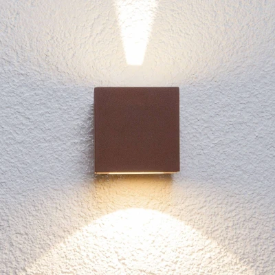 Lights.coRust-brown Jarno LED outdoor wall light with an effective glow In principle, you can't go wrong with a cube when you're looking for a timeless shape that can be used anywhere. The body of this LED outdoor wall light is made of rust-brown lacquered metal. Very discreet when it is not switched on, the special feature of this wall light unfolds when the LED bulb is switched on. The light strips are effectively reflected on the wall behind. It is only a narrow strip at the top, but the warm white light spreads out at a wide angle at the bottom. The rust-brown surface of the LED wall light gives it a rustic character, so it also looks good in the surroundings of older houses and properties. Another light grid is included in the scope of delivery, so that the following light patterns are possible for an individual design: - narrow at the top and wide at the bottom - wide at the top and bottom - narrow at the top and bottom - wide at the top and narrow at the bottom