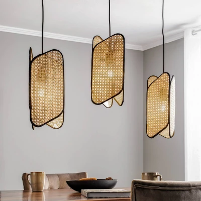 Lights.coThree-lamp design pendant lamp Bassiola with three-sided lampshades made of bamboo in Viennese weaveBassiola convinces as a dining room pendant lamp all along the line and conjures up a salient light image that is characterized by pure coziness and magically combines shadow and light. Thus, this pendant lamp fits wonderfully into all boho styles that focus on a natural choice of materials with correspondingly bright natural colors, as well as on a quite cozy appearance. Each of the three shades has three angled elements made of bamboo in the look of Viennese wicker, which is a beautiful classic for the living area and has enjoyed great popularity since the last century. The wicker is edged in black and in the dining room or in the living room above the coffee table, the three-lamp pendant lamp makes a really nice figure. The exclusive design goes back to Ingo Thiele and embodies a very stylish expression.