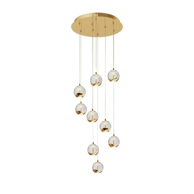 Experience the elegance and modernity of the Hayley 9 Pendant Light, a striking fixture that seamlessly combines upscale design with energy-efficient LED technology. This captivating lamp features a harmonious constellation of nine exquisite glass spheres, each adorned with an eye-catching bubble structure that enhances the overall aesthetic appeal. The spheres are crafted in a sophisticated gold finish, giving the light an opulent touch that fits beautifully in various settings, from contemporary apartments and lofts to chic cafes and hotels.