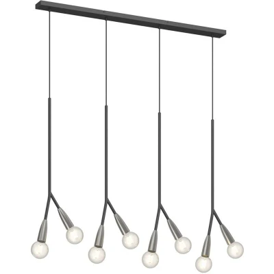 Eight-bulb Carlea pendant light in black and nickel - optimal light source for dining table Carlea is an attractive dining table hanging light in a modern style that delights people with its design qualities. Four branched lighting elements come out of the ceiling canopy, each of which has two E27 sockets. This design means that Carlea is an eight-bulb pendant light that is perfect for use over a dining table because it makes a bright, large-area illumination of the table surface possible. The light bulbs are not only relevant in a technical respect for producing light. They also dominate the appearance of the hanging light. Therefore, light bulbs should be chosen that visually complement the overall look. Filament bulbs with LED technology meet this requirement very well.