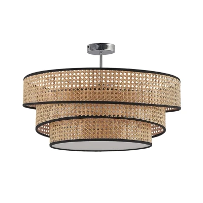 ManoManoGeneral description Lucande Elowen ceiling light features a stylish industrial design, perfect for enhancing the modern vibe of your living room, dining room, or office. This striking ceiling light consists of three lampshades made of rattan wickerwork, positioned at different heights to create an interesting shape and a cozy ambiance. The light-colored wood has small openings that refract the light, generating an attractive play of light, making it an eye-catching addition to flat ceilings. Technical specifications Diameter: 56 cm Socket type: E27 (three sockets) Usage The Elowen ceiling light is easily dimmable, allowing you to adjust the light intensity in your room with an extra dimmer switch (not included). It creates a warm and inviting atmosphere, making it ideal for both casual gatherings and intimate settings. Other information