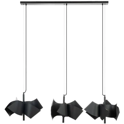 Lights.coStriking pendant lamp Imron made of sand-black steel with three lampshadesImron brings stylish designer aspects into your own four walls. The hanging lamp consists of an elongated ceiling fixture, to which three suspensions are attached, each of which carries a lampshade. These shades have a playful design and can be equipped with appropriate bulbs. Imron's design comes from the portfolio of designer Ingo Thiele and serves as a memorable decorative piece for a living room or a bedroom. However, the pendant lamp Imron can also be used for lighting a table and thus provide the necessary light for a dinner.