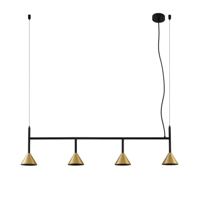 Elegant Kartio pendant light with four conical lampshades and a delicate steel cable suspension system The Kartio pendant light delights people at first glance with its structured, geometrical shapes and its minimalist design. A horizontal rod made of matt black iron, along which the four light sources are distributed in a symmetrical arrangement, is fixed to two steel cable suspension systems. The lampshades have an elegant brass finish, which gives them an upmarket and elegant flair. They are defined by their geometrically clear conical shape and emit their light gently downwards in a targeted manner thanks to this shape. This prevents the beholder from being dazzled and ensures that the area beneath the light is optimally illuminated. This makes this attractive light particularly suitable for use over a large dining table. In addition, you can use dimmable bulbs and an external wall dimmer to control the light output of the Kartio hanging light in order to provide the right lighting for any everyday situation.