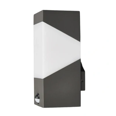 Lights.coKiran outdoor wall light with motion detector It is immediately apparent: the line is the defining feature of this modern-looking outdoor wall light made of aluminium. The body of the light is entirely angular, with no curves to be found. This look is what makes the outdoor wall light ideal for modern façades and house surroundings. A special detail is the white polycarbonate diffuser, which is embedded in the light on the side in the shape of a triangle or, if you look closely, actually in a trapezoidal shape, creating a contrasting yet harmonious appearance. The integrated motion detector adds functionality and convenience, as it switches the light on whenever it is needed, making the feeling of standing in the dark a thing of the past. - Detection angle: 120° - Range: max. 9 m - Lighting time adjustable from 5 seconds to 8 minutes