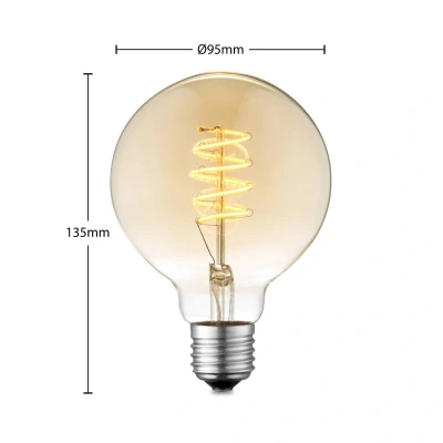 Lights.coE27 G95 LED globe bulb 4W with a warm white light, dimmable, CRI > 90 The filament rod has been designed in a spiral shape, which looks very special and is particularly effective in an open light. Even unshaded lighting objects benefit from this decorative bulb. With its particularly good colour rendering, it is possible to display the colours in the room as authentically as possible. Technical data - Dimmable via leading edge and trailing edge dimmers - CRI >; 90 Special features - Filament look - Decorative character