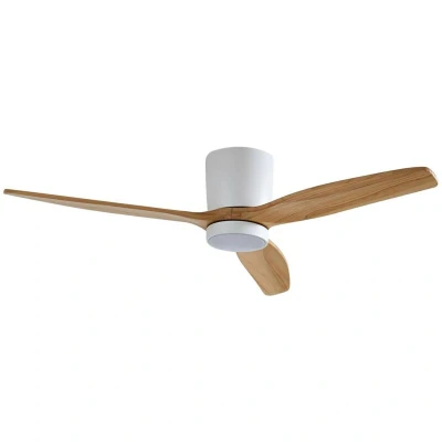 Lights.coFaipari LED ceiling fan with remote control The Faipari LED ceiling fan not only provides good general lighting but also reliable operation in both summer and winter, ensuring the best temperature conditions in your living area. Its natural look, which consists of three wooden blades and a white housing, is immediately eye-catching even when it is switched off. In addition, the integrated DC motor guarantees quiet operation. A remote control is included. This makes it easy to control the fan. In addition to the light settings, timers and the various speed levels can also be selected. Technical details - Light colour adjustable in three stages Power per speed: - 40 watts at 200 rpm - 21.4 watts at 139 rpm - 4.1 watts at 80 rpm - Maximum air flow: 170 m³/min - Maximum air speed: 2.75 m/sec - Fan sound power level: 47 dB (A) - Service value (SV): 4.88 (m³/min)/W - The remote control requires 2 x AAA NiCa batteries