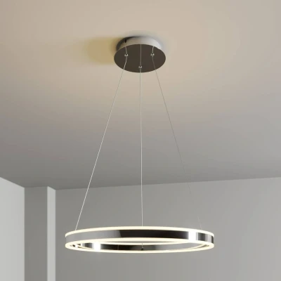 Lyani - three-stage wall switch dimmable pendant light with integrated LED technology This LED hanging light consists of a large, luminous ring, making it ideal for installing above a table in the kitchen or dining room. The ring has a shiny chrome finish and hangs from the ceiling on delicate wire cables. Because different levels of brightness are often required above a dining table depending on the situation, the pendant light can be dimmed in three stages using a wall switch to create both bright and cosier light with a lower light output.