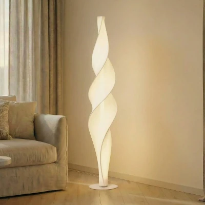 Lamp MastersThe Novelle spiral LED floor lamp in white The Novelle floor lamp is a stylish highlight for any home, as its unique shape and appearance immediately catch the eye. It is made of malleable, elastic plastic material that resembles fabric. With this light, designer Ingo Thiele has created a timeless piece that impresses with both its aesthetics and functionality. The brightness and light colour can be conveniently adjusted using the foot switch on the cable. - Integrated dimmer (press and hold the foot switch for a long time = dimming function, press briefly for CCT and on/off) - Infinitely dimmable from 15 - 100% - Light colour adjustable in three stages: 2,700 K / 3,400 K / 4,000 K