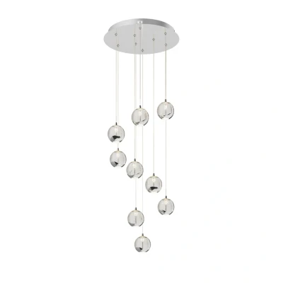 Lights.co9-bulb LED pendant light Hayley with extravagant glass spheres in a modern chrome look The beautiful Hayley LED pendant light exudes luxurious flair and elegance. With its nine light sources, it can illuminate even larger areas of a room and leaves a unique impression on the viewer. The light is distributed evenly throughout the room, ensuring indirect, glare-free illumination. The nine glass spheres feature decorative air bubbles on the inside, with each one encircled by a metal element on the underside. The modern chrome look, which is also used for the round canopy of the light, emphasises its sophisticated character and makes it a distinctive light source. This ingenious design makes the light an extravagant home accessory even when switched off.