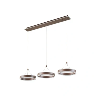 Dimmable LED pendant light Kolo in coffee brown with three ring-shaped lampshades Three modern rings characterise the look of the Kolo LED pendant light. They are arranged side by side and finished in an attractive coffee brown, while the light-emitting surface is covered by a white frosted shell. The elongated, angular canopy picks up this colour combination and harmoniously complements the overall look. The efficient light from the built-in LEDs can escape glare-free through the white plastic diffuser in its warm white light colour and provide good general lighting. A wall switch allows the light to be switched on and off as usual. Thanks to the 3-step dimming technology with integrated off function, it can also be dimmed to three different brightness levels by pressing the switch several times: 100%, 40% and 10%.