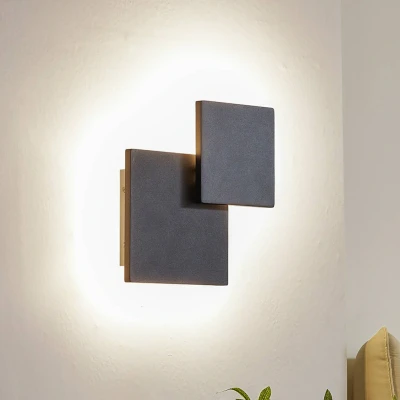 Lights.coElrik LED wall light for indirect light The Elrik LED wall lamp has a simple, minimalist appearance and an angular shape. It is made up of two squares of different sizes, which are positioned next to each other. The opaque metal body of the two elements in black has an integrated LED module on the back, which creates indirect lighting with warm white light. The light is shone against the wall and provides accent lighting around the frame - can also be used as a ceiling light