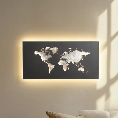 Lamp MastersWorld LED wall light – stylish wall decoration in a world map design The World LED wall light is a decorative statement piece for your living space. Its anthracite and silver design stylishly and modernly interprets the silhouette of a world map. The robust metal housing suits many interior design concepts and makes the light a striking accent in the living room, hallway or bedroom. The integrated LED technology produces a pleasant warm white light of 3,000 K, which bathes every room in a cosy atmosphere. Thanks to a colour rendering of 80 Ra, colours appear natural and harmonious. At the same time, the permanently installed LED light source scores with high energy efficiency and a long service life – ideal for anyone who values expressive design with functional added value.