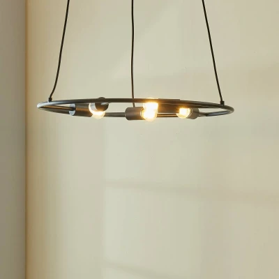 Lights.co5-bulb Linnard pendant light in a striking black steel design Linnard impresses with its stylish designer look and is an attractive addition to any interior. The pendant light consists of a circular element made of black steel with five exposed sockets that can be fitted with appropriate bulbs. The use of filament bulbs can further emphasise the appearance of the light. Linnard cuts a particularly fine figure in a living room or bedroom and transforms any room into something very special. The idea for the design of the light comes from Ingo Thiele.