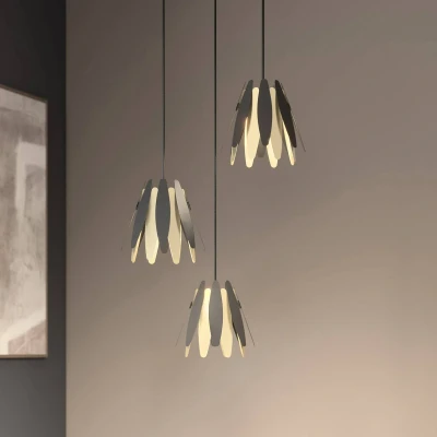 Beautiful design ensemble of three fan-shaped metal lamp shades in black and gold: the Lounit pendant luminaire Here, classic lampshades seem to have been radically reinterpreted, because the Lounit design pendant luminaire has shades that appear quite classic in shape (round and narrower towards the top), but at the same time have a very trendy, design-oriented expression. This is because the design is of a playful lightness, but the luminaire itself is made of strong, solid metal. The resulting tension makes the luminaire a unique lighting object for the living area, where the luminaire can be used especially above a dining table. The elongated, oval rounded metal segments are arranged around the lamp socket when mounted via a plug-in system. Although the metal is opaque, the special fan-shaped arrangement creates attractive lighting effects which can also be admired as beautiful shadows in the room. The ambient lighting appears pleasant and light and is characterised by a cosy effect, while the useful areas below the luminaire are very well illuminated.