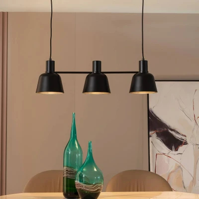 General description This stylish Lucande Servan pendant light features a modern industrial design, making it a perfect addition to your living room, dining room, or office. Its sleek black finish and three lampshades create a warm and inviting atmosphere, enhancing the aesthetic of any contemporary space. Technical specifications Material: Metal (iron) Color: Matt black Number of lampshades: 3 Installation Requires installation of a dimmer switch (not included) for adjustable light intensity. Usage Ideal for illuminating table or counter surfaces with a focused downward light. Perfect for creating a cozy atmosphere in kitchens and dining rooms. Other information