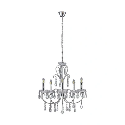 Lamp MastersSolveig Pendant Chrome/Clear 5 is an expression of modern luxury and excess. The design of the lamp combines the classic chandelier that exudes traditional opulence and elegance with a cool, modern touch through its beautiful chrome-coloured frame and clear crystal elements. The frame winds in curved, twisting tendrils that give the lamp a playful and romantic look, which is only enhanced by the many crystals that are neatly arranged to form an intricate pattern. The lamp's sockets are disguised as candle holders, emphasising the traditional look. The sockets are suitable for E14 light bulbs that emit a clear and direct light on all sides, as lampshades are not part of the lamp's design. The light reflects off the crystals, illuminating the entire lamp structure in an impressive display that turns a simple dinner into a real party. The pendant light is particularly suitable for restaurants, hotel lounges or other large rooms.