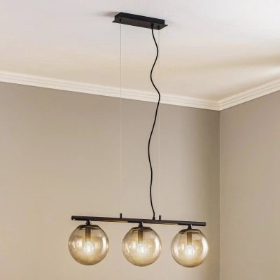 ManoManoGeneral description This dimmable ceiling light 'Sotiana' features a sleek black frame and decorative smoked grey glass globes, making it an ideal choice for illuminating dining and living areas. The design combines vintage qualities with contemporary aesthetics, creating a warm and inviting atmosphere in your home. Technical specifications Type: 3-bulb linear pendant light Material: Glass and metal Color: Black frame with smoked grey glass shades Installation Requires installation of a dimmer switch (not included) for adjustable light intensity. Usage Perfect for illuminating table surfaces in dining rooms or living rooms. Enhances the atmosphere of your home, suitable for both summer and winter use. Other information