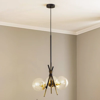 General description This stylish and modern ceiling light, the 'Sotiana', features a unique industrial design that enhances the atmosphere of any living room, dining room, or office. With its elegant combination of clear glass shades and brass fittings, this pendant light serves as a striking design object that adds a touch of luxury to your space. Technical specifications Type: Pendant light Number of bulbs: 3 Material: Metal, glass Color: Black frame with brass fittings Shade type: Spherical glass shades Installation Easy to install in living rooms and dining rooms. Usage Easily dimmable with an additional dimmer switch (not included). Ideal for creating a cozy and warm atmosphere in your home. Compatible with a variety of bulbs, especially filament LED bulbs for optimal aesthetic appeal. Other information